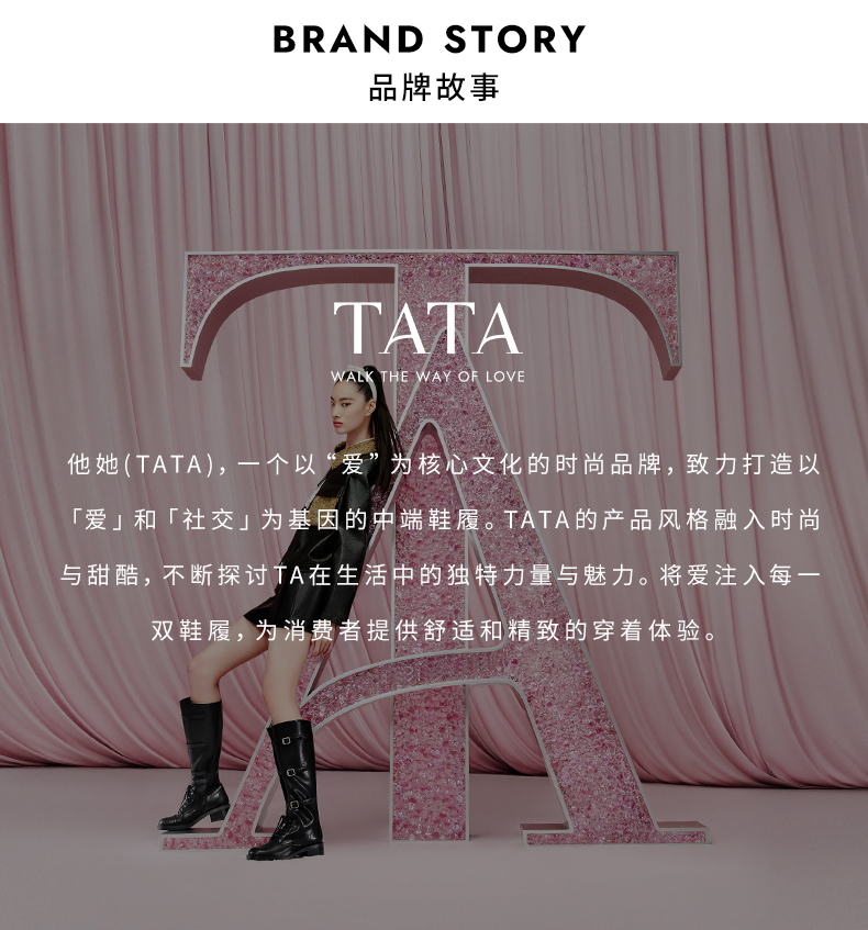 他她(Tata),品牌成立于2003年,致力为都市年轻人群提供时尚潮流、具有性价比的鞋履产品。十五年来“踏踏”的着地声,寓意都市白领元气满满的生活,如时尚“伴履”的TATA一直陪伴左右、伴随走出TATA的时尚步伐。2017年TATA美丽蜕变,TATA STAR元素的加入预示品牌将成为闪亮、前端的时尚鞋履品牌。