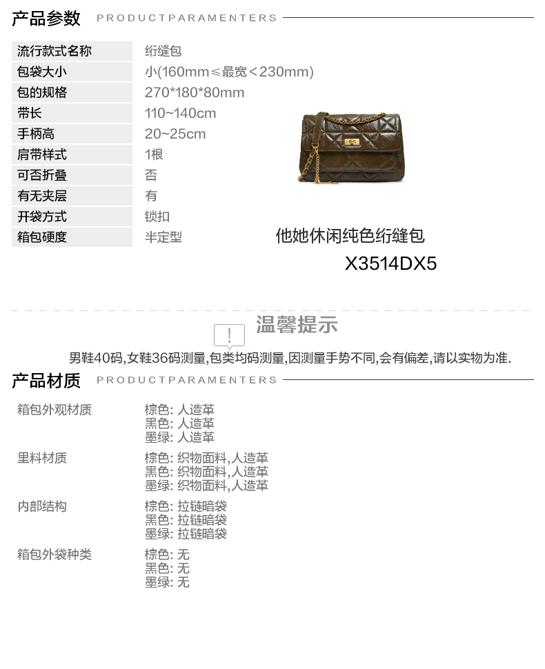 | 适用场景:休闲 | 开袋方式:锁扣 | 性别:女子 | 手柄高:20~25cm | 里料材质:织物面料人造革 |
