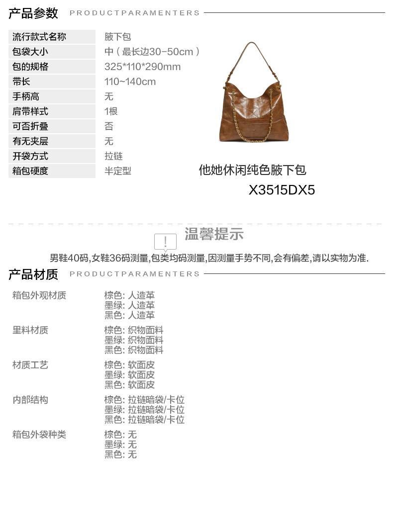 | 包的规格:32x11x29cm | 闭合方式:拉链 | 背带方式:手提/单肩 | 内部结构:拉链暗袋/卡位 | 风格:休闲 |