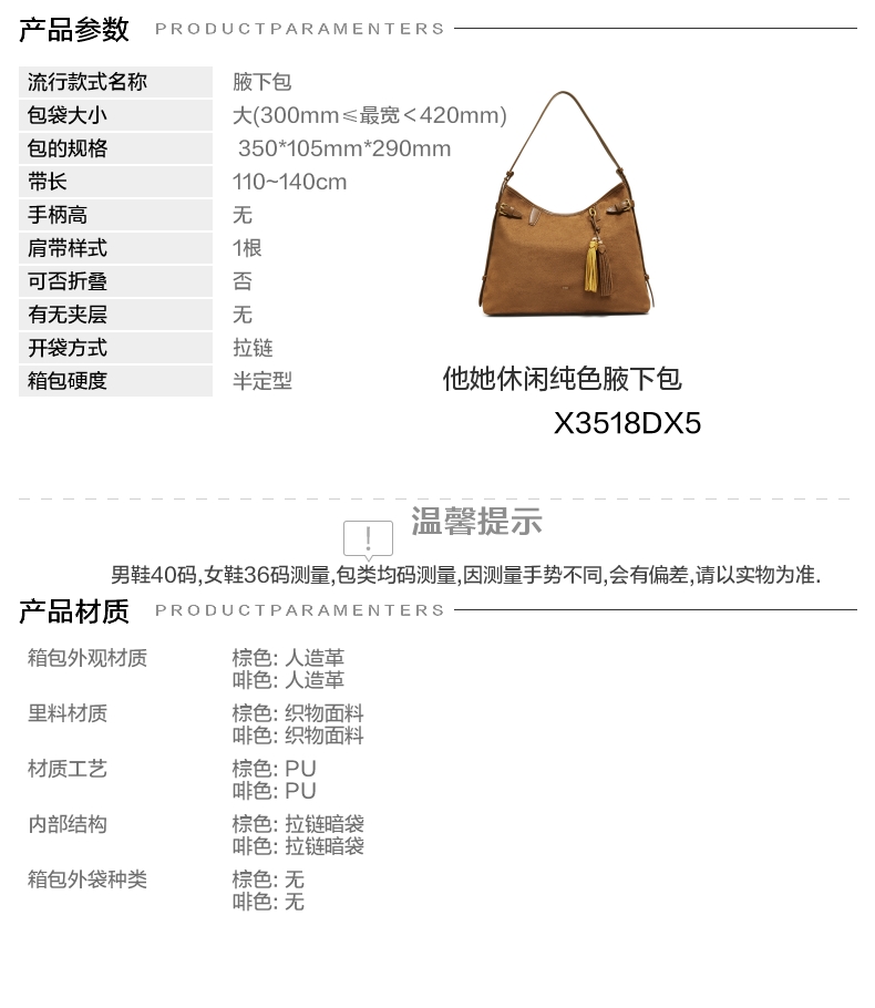 | 包的规格:350*105mm*290mm | 闭合方式:拉链 | 背带方式:手提/单肩 | 内部结构:拉链暗袋 | 风格:休闲 |