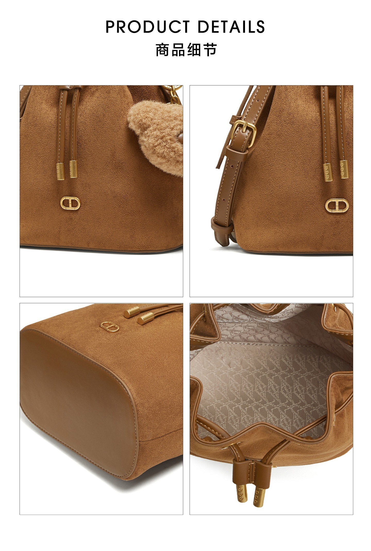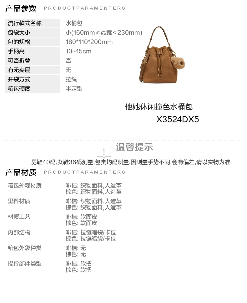 | 开袋方式:拉绳 | 性别:女子 | 是否防水:否 | 里料材质:人造革织物面料 | 手柄高:10~15cm |