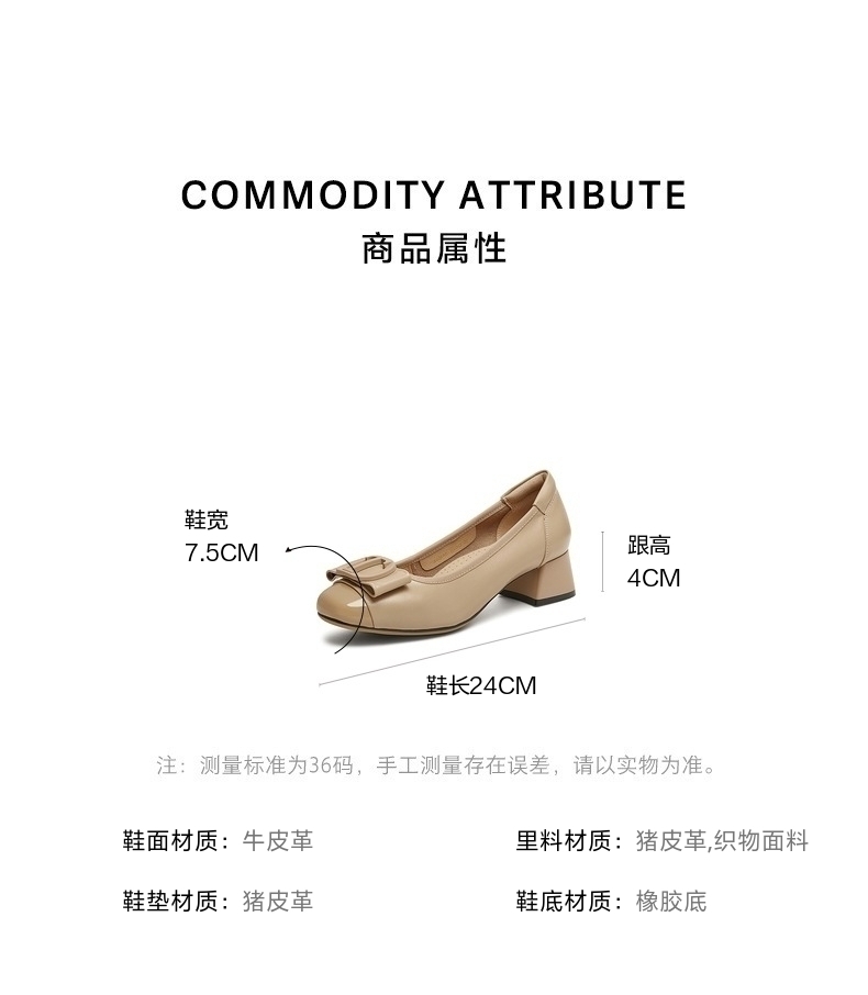 | 参考标准尺码:36码 | 跟高数值:4CM | 性别:女子 | 里料材质:猪皮革织物面料 | 制鞋工艺:胶贴皮鞋 |