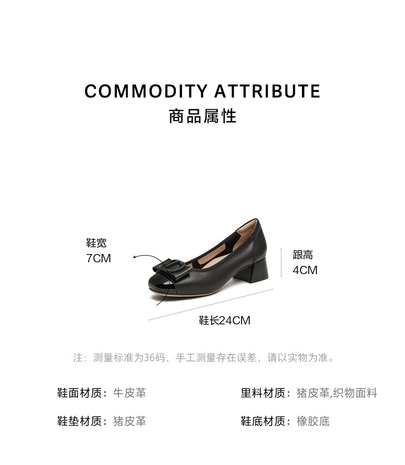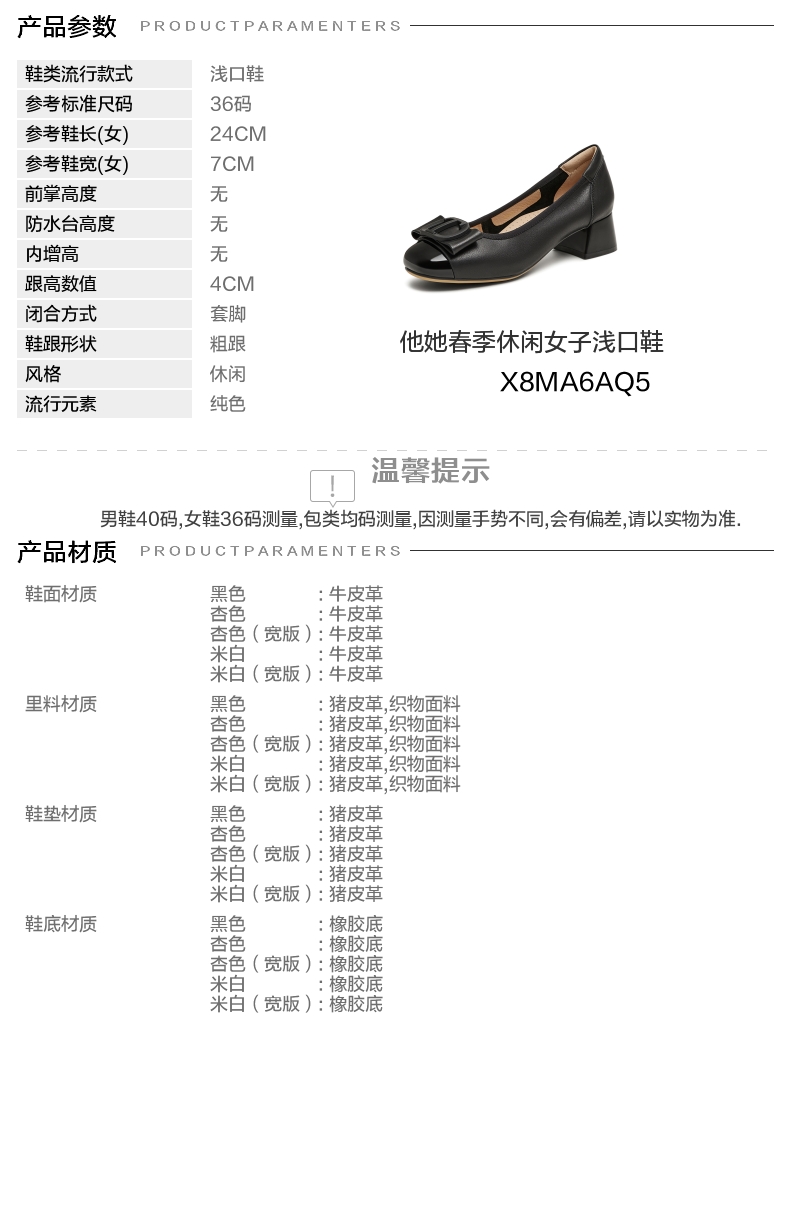 | 参考标准尺码:36码 | 跟高数值:4CM | 性别:女子 | 里料材质:织物面料猪皮革 | 制鞋工艺:胶贴皮鞋 |