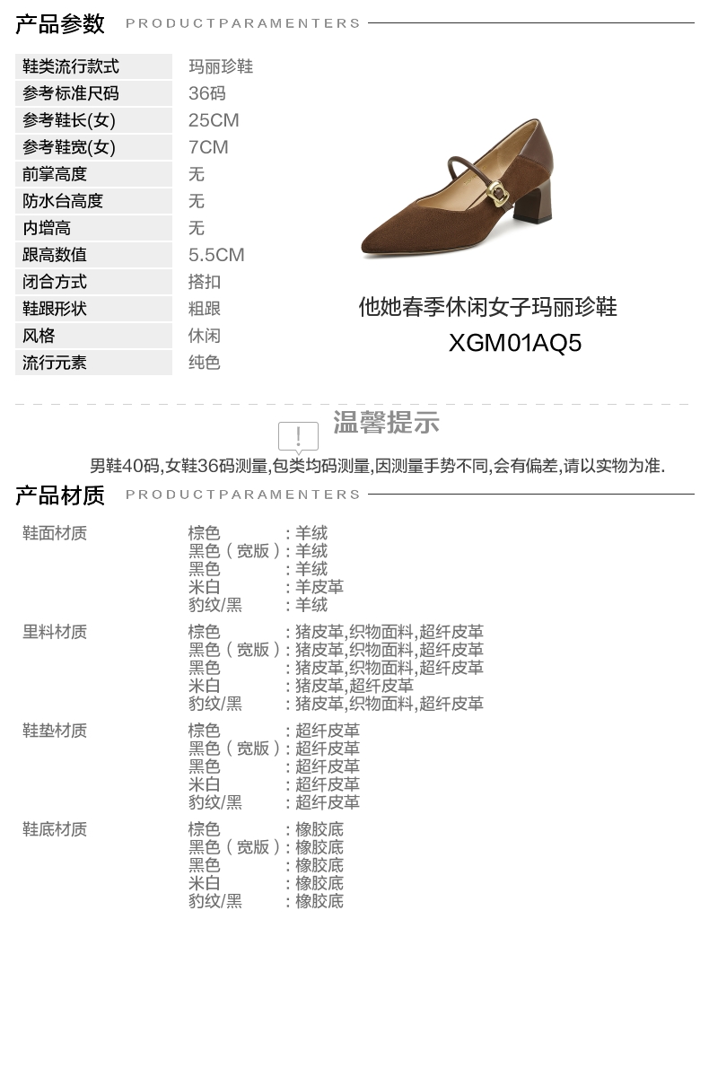 | 参考标准尺码:36码 | 跟高数值:5.5CM | 性别:女子 | 里料材质:超纤皮革织物面料猪皮革 | 制鞋工艺:胶贴皮鞋 |
