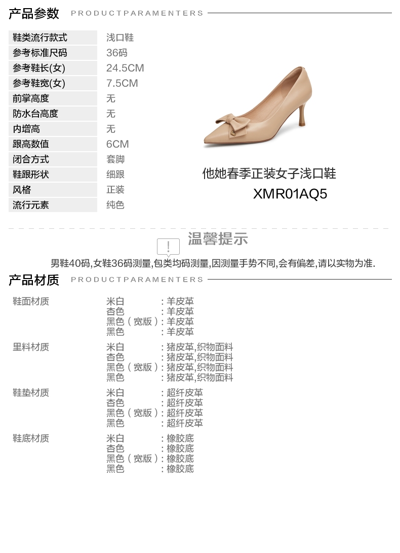 跟高数值:6CM 性别:女子 里料材质:织物面料猪皮革 制鞋工艺:胶贴皮鞋 款式季节:春季