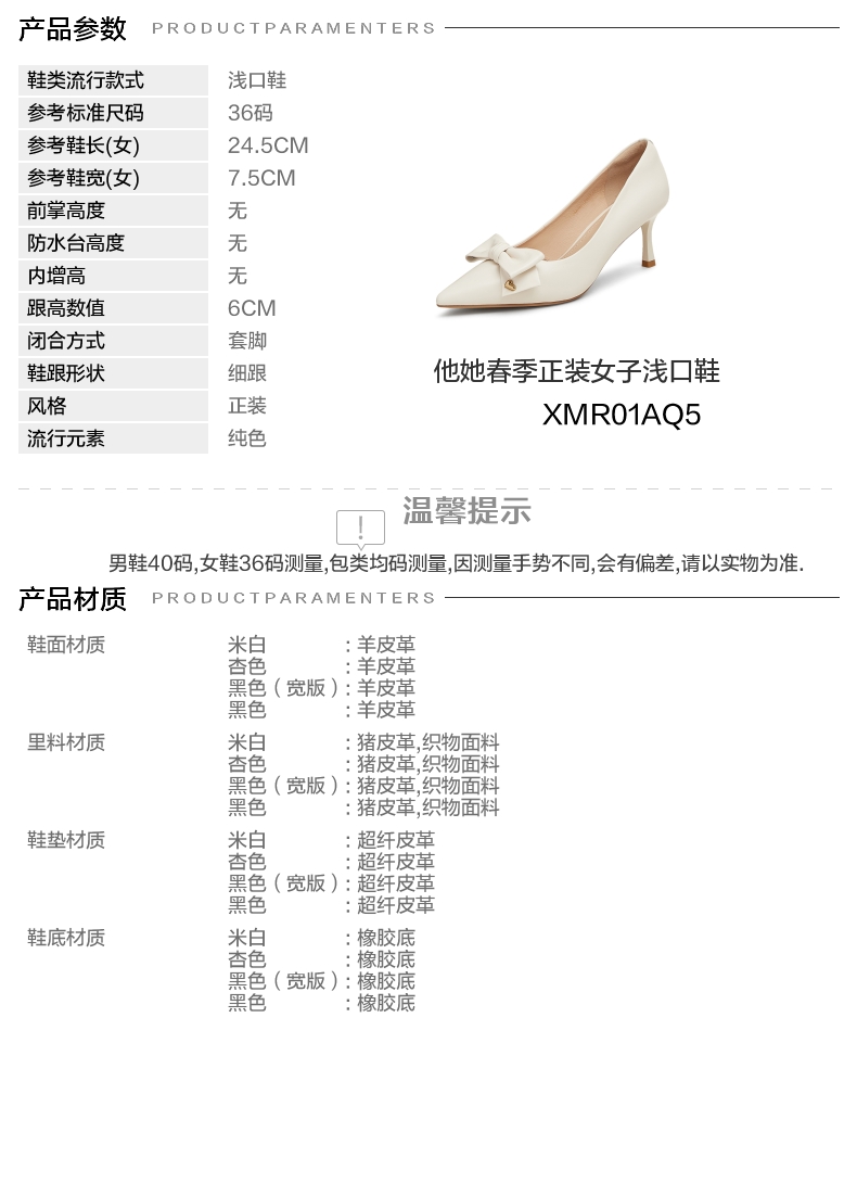 | 跟高数值:6CM | 性别:女子 | 里料材质:织物面料猪皮革 | 制鞋工艺:胶贴皮鞋 | 款式季节:春季 |