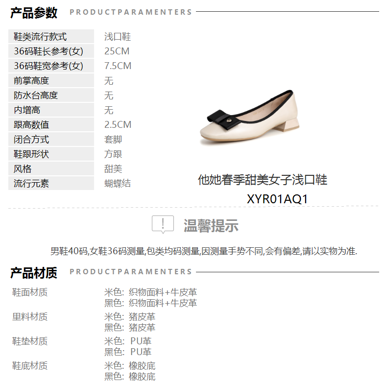 | 鞋跟形状:方跟 | 参考鞋长(女):25CM | 流行元素:蝴蝶结 | 参考鞋宽(女):7.5CM | 风格:甜美 |