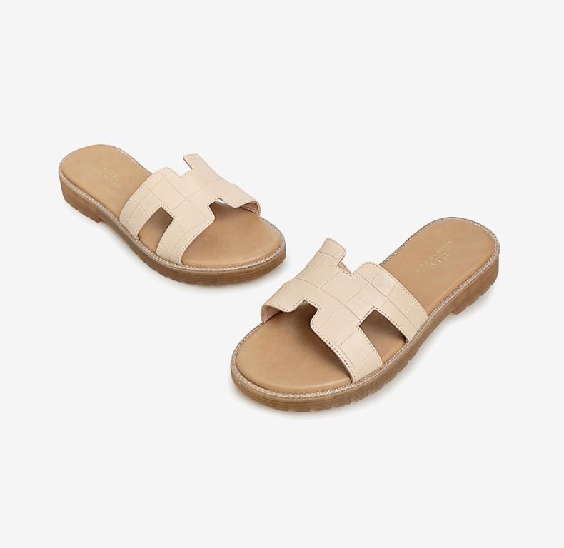 | 鞋头款式:露趾 | 鞋底材质:橡胶底 | 鞋面图案:纯色 | 鞋跟形状:平跟 | 鞋面材质:羊皮革 |