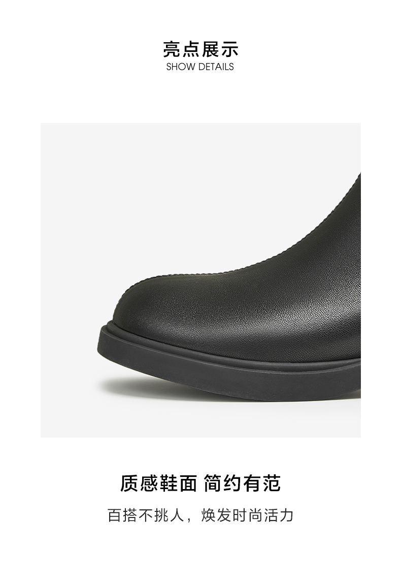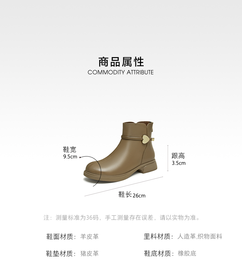 | 鞋底材质:橡胶底 | 靴筒内里材质:织物面料人造革 | 内增高:无 | 鞋面材质:羊皮革 | 闭合方式:后拉链 |