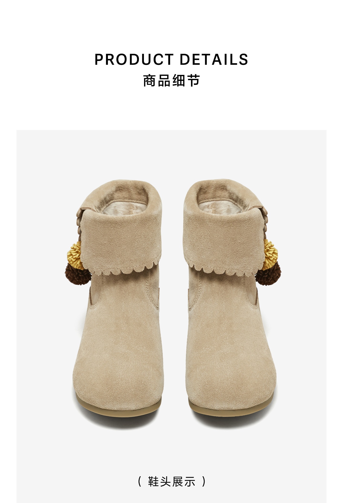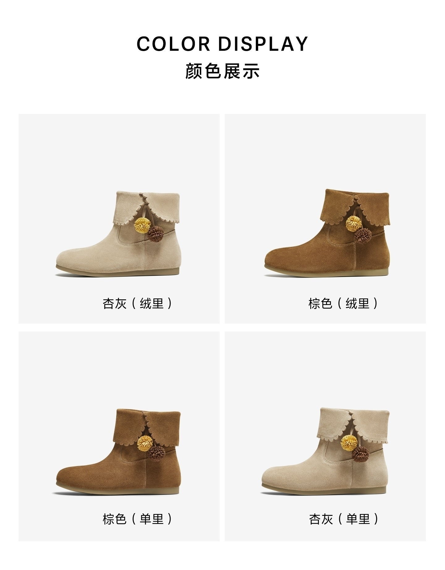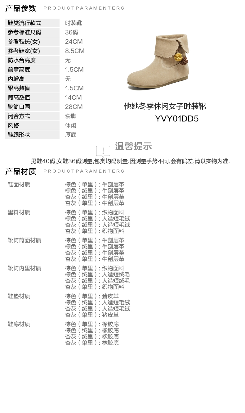 | 性别:女子 | 靴筒筒面材质:牛剖层革 | 里料材质:人造短毛绒 | 制鞋工艺:胶贴皮鞋 | 鞋垫材质:人造短毛绒 |