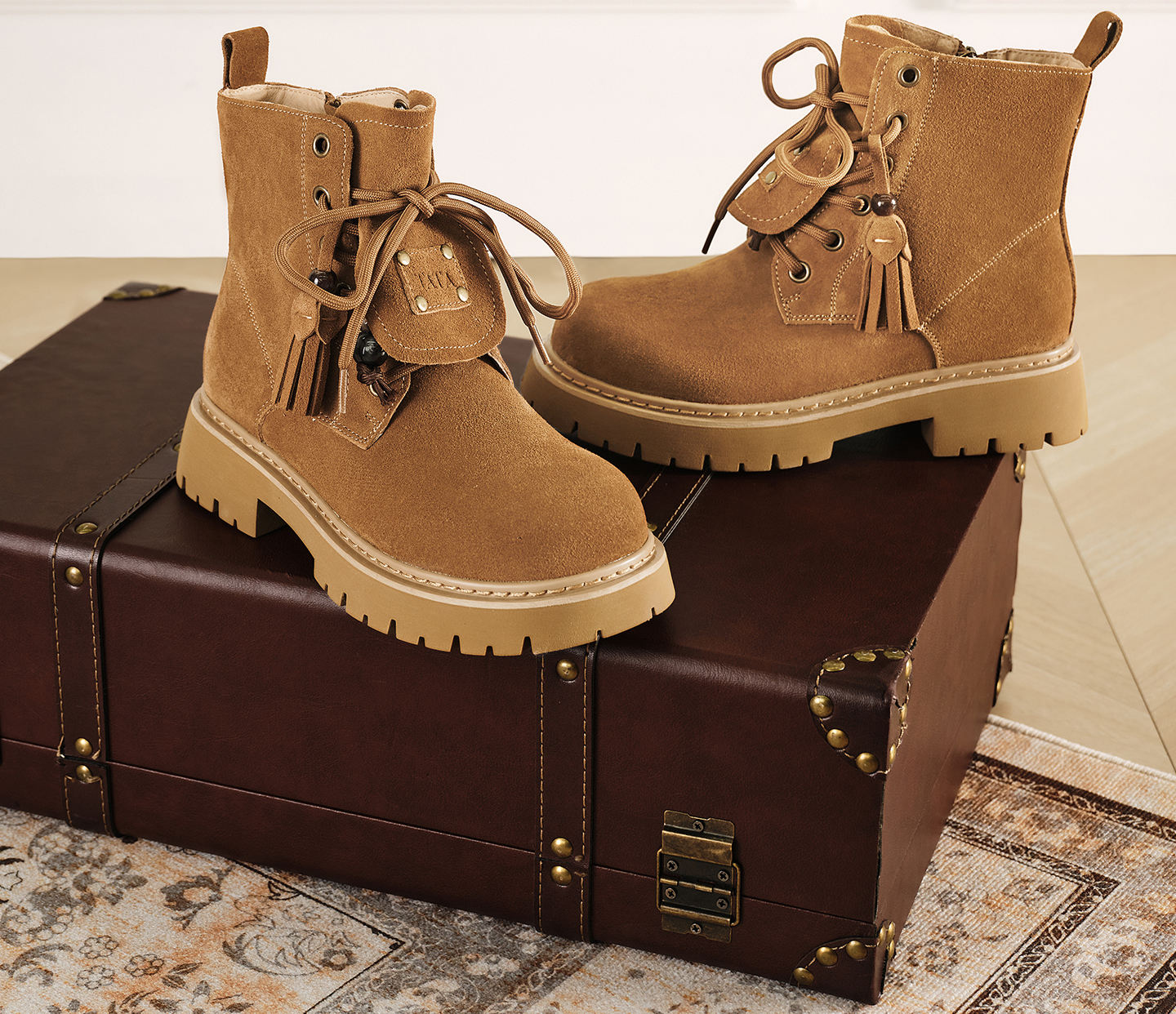 | 鞋底材质:橡胶底 | 靴筒内里材质:人造短毛绒 | 内增高:无 | 鞋面材质:牛剖层革 | 闭合方式:系带 |