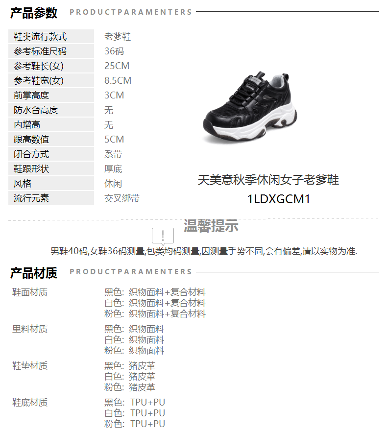 | 皮质特征:合成革 | 前掌高度:3CM | 防水台高度:无 | 鞋类流行款式:老爹鞋 |