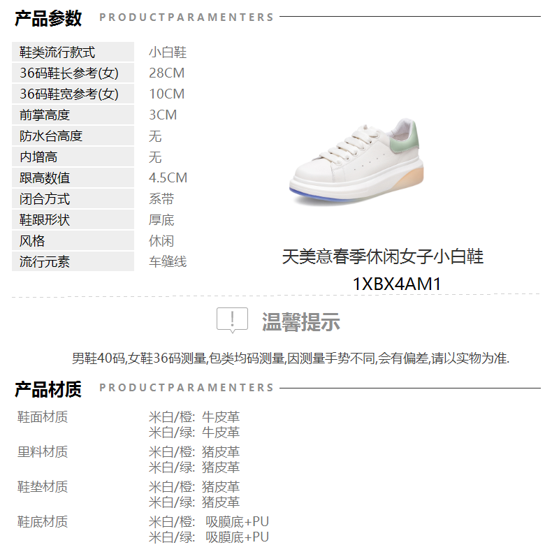 | 色系:白色 | 跟高数值:4.5CM | 性别:女子 | 里料材质:猪皮革 | 制鞋工艺:胶贴皮鞋 |