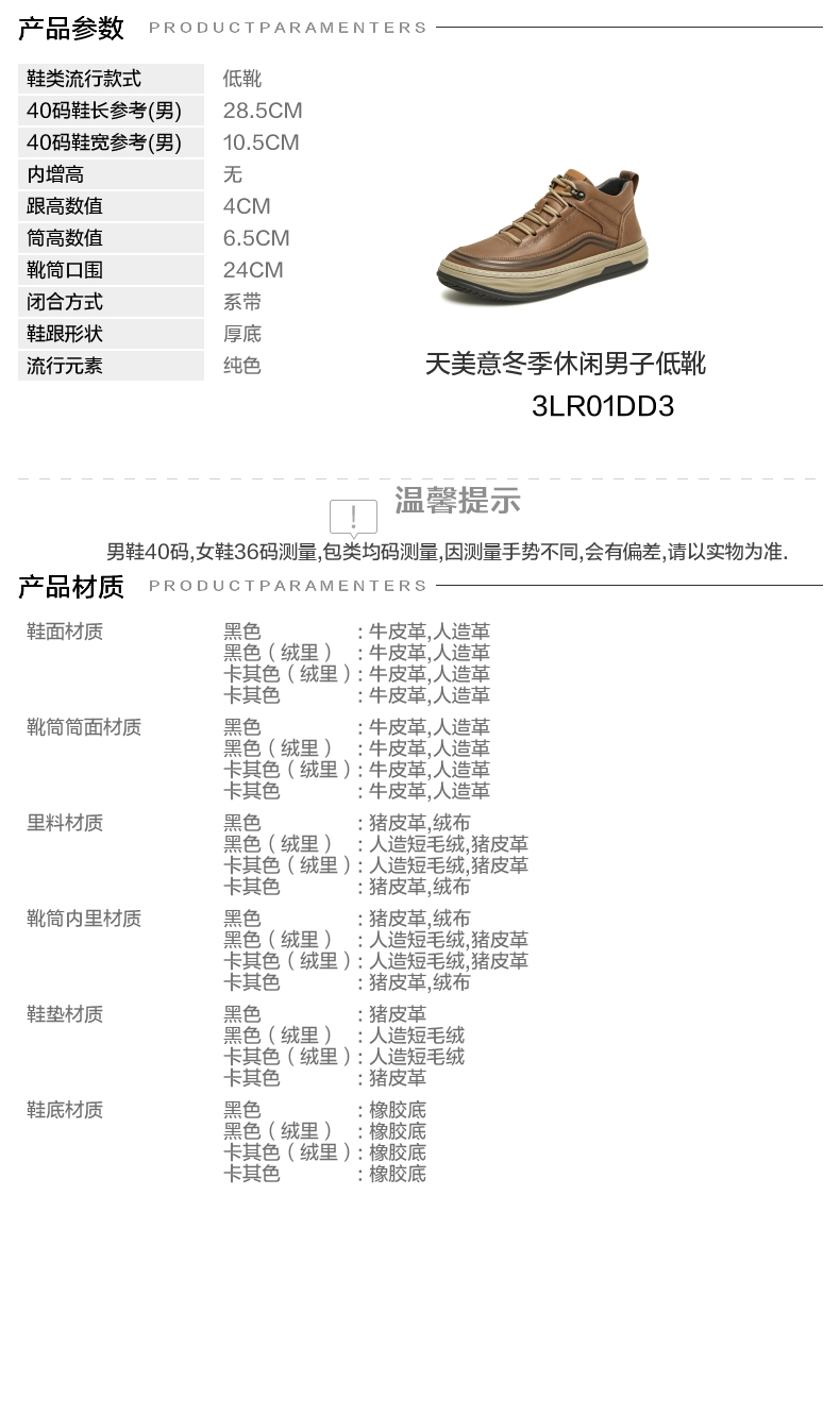 | 筒高数值:6.5CM | 性别:男子 | 靴筒筒面材质:牛皮革人造革 | 里料材质:绒布猪皮革 | 制鞋工艺:胶贴皮鞋 |
