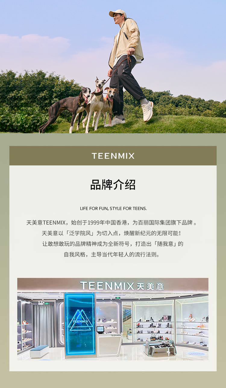 Teenmix(天美意),作为一个都市时尚休闲品牌,倡导“life for fun ,style for teens”即 “人生追求情趣,年轻追求个性”的生活品位,迎合都市年轻人不拘一格,追求mix&match自由组合,创出自我风格的潮流理念。Teenmix向人们展示了流行的转变,强调创意与个性,“teen”代表一群张扬个性、散发活力、追求都市炫彩生活的新新人群;“ mix”即mix&match,代表时尚混搭精神,品牌为年轻人提供恍如贴身订造的时尚潮品,并因应时尚的转变而响应。“随我意,天美意”传达了品牌的主张与个性。