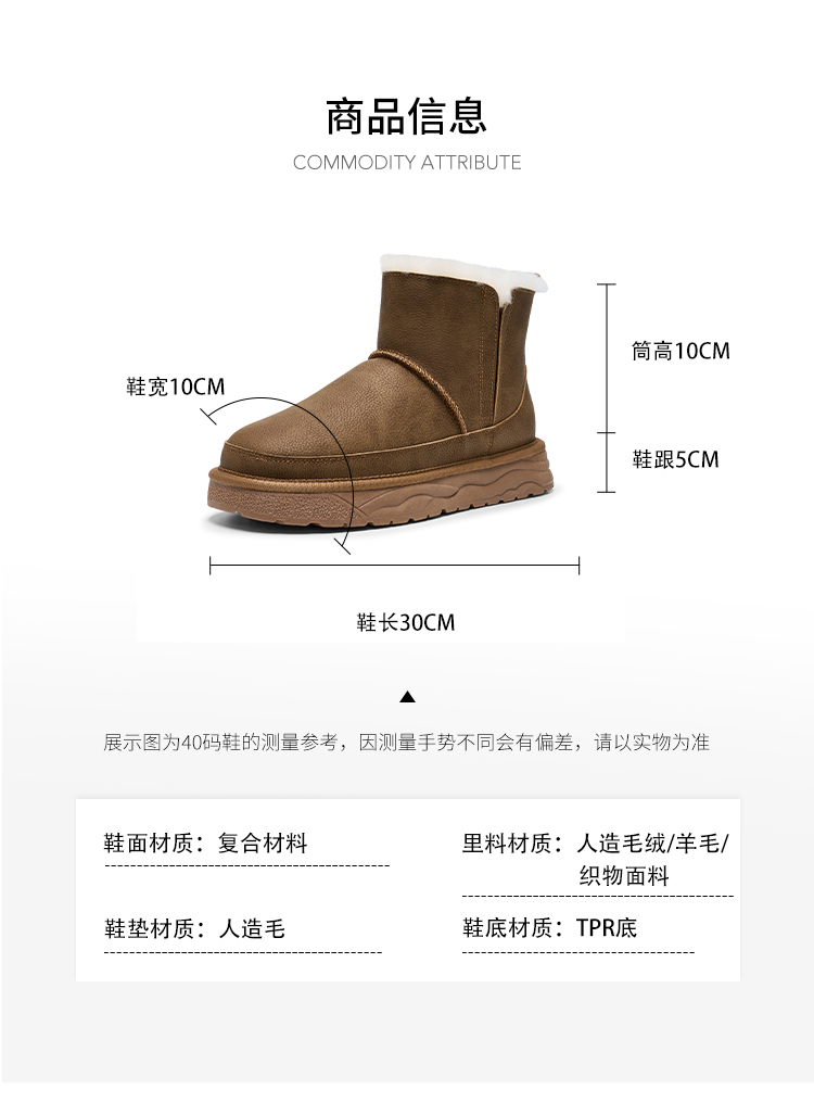 | 40码鞋长参考(男):30CM | 鞋头款式:圆头 | 鞋底材质:TPR底 | 鞋面图案:纯色 | 靴筒内里材质:织物面料羊毛人造毛绒 |