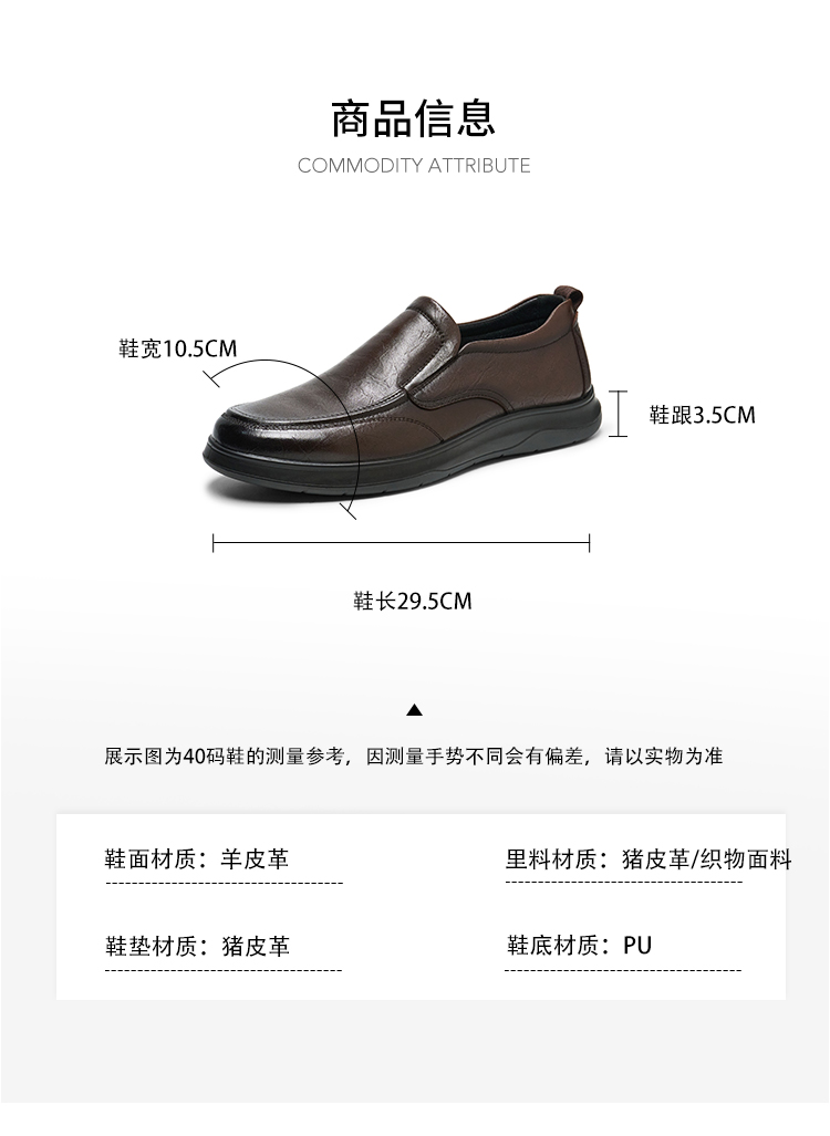 | 风格:休闲 | 色系:棕色 | 跟高数值:3.5CM | 40码鞋宽参考(男):10.5CM | 性别:男子 |
