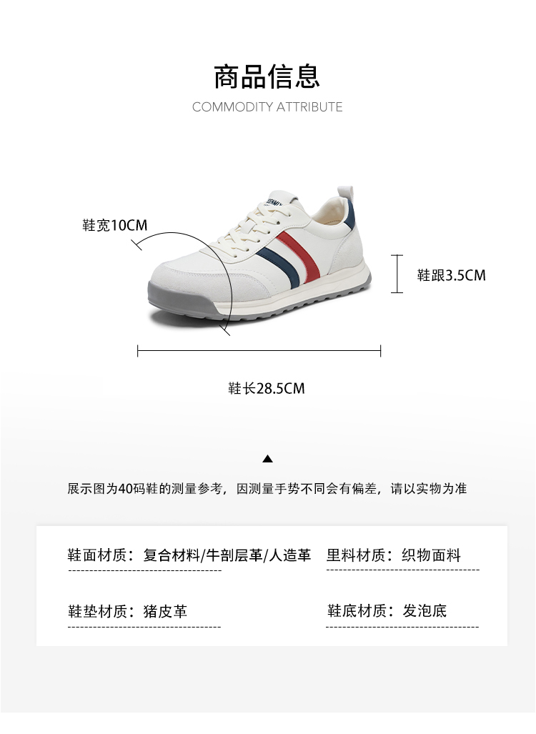 | 40码鞋长参考(男):28.5CM | 鞋帮:低帮 | 功能科技:耐磨 | 鞋底材质:发泡底 | 内增高:无 |