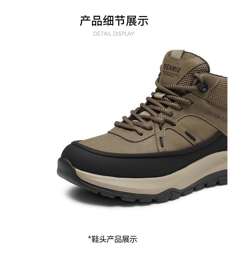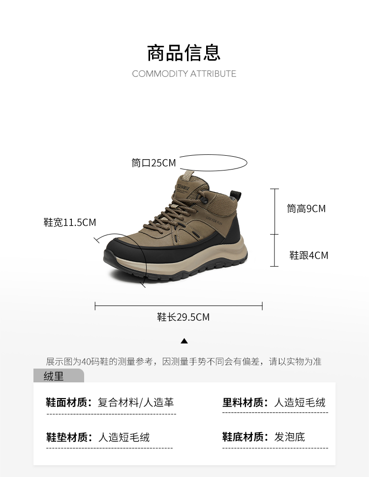| 风格:休闲 | 色系:卡其 | 跟高数值:4CM | 40码鞋宽参考(男):11.5CM | 筒高数值:9CM |