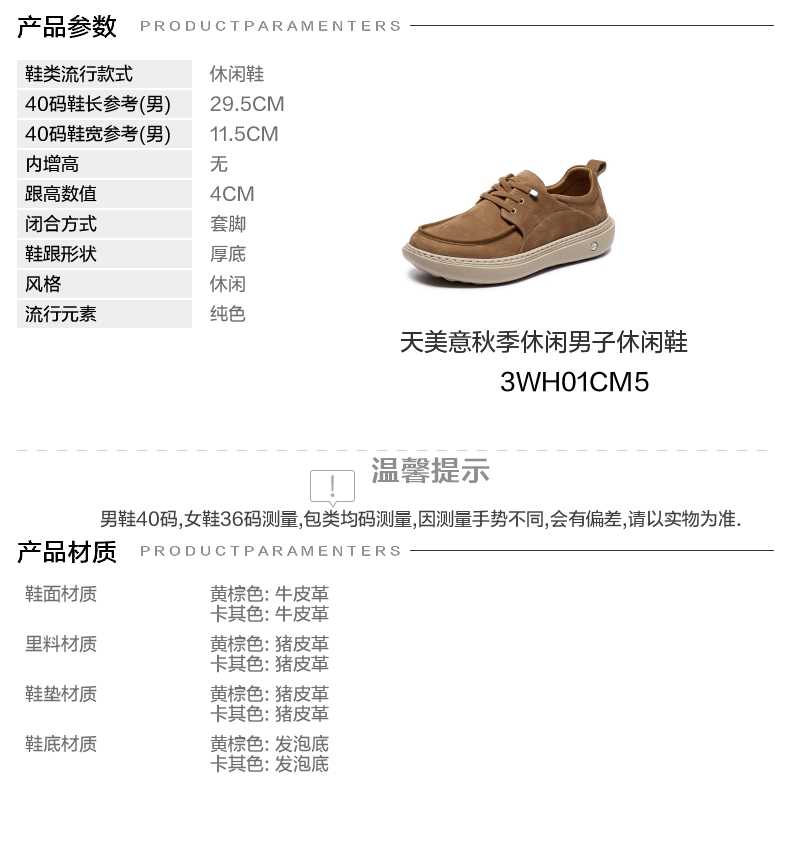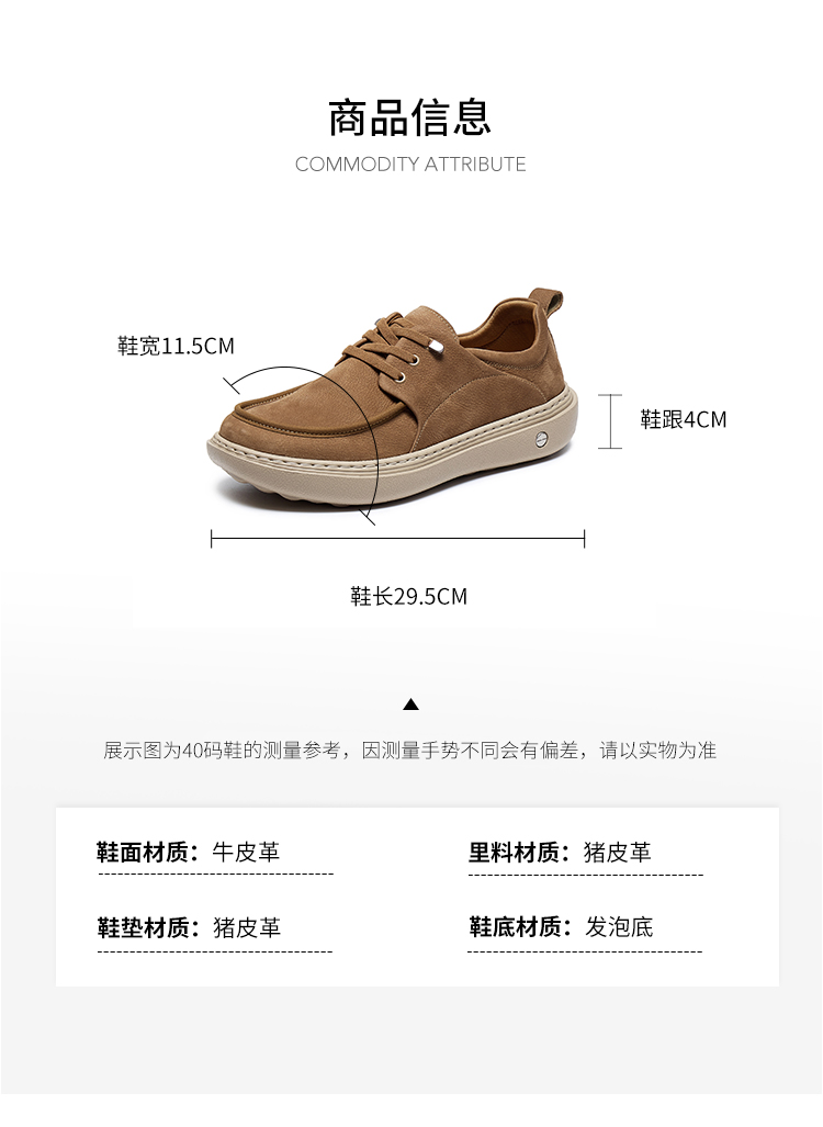 | 风格:休闲 | 色系:棕色 | 跟高数值:4CM | 40码鞋宽参考(男):11.5CM | 性别:男子 |