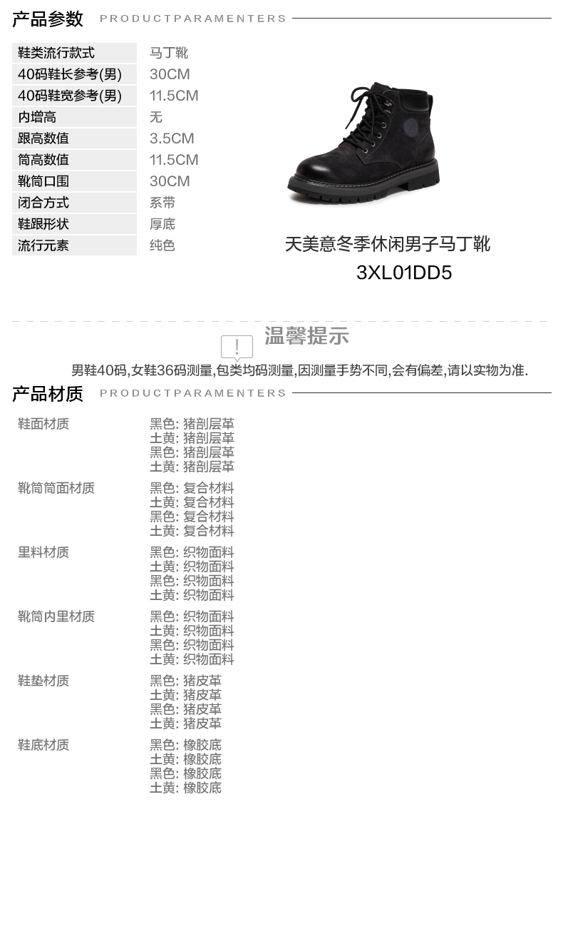 | 闭合方式:系带 | 40码鞋宽参考(男):11.5CM | 靴筒口围:30CM | 上市时间:2025年冬季 | 鞋类流行款式:马丁靴 |