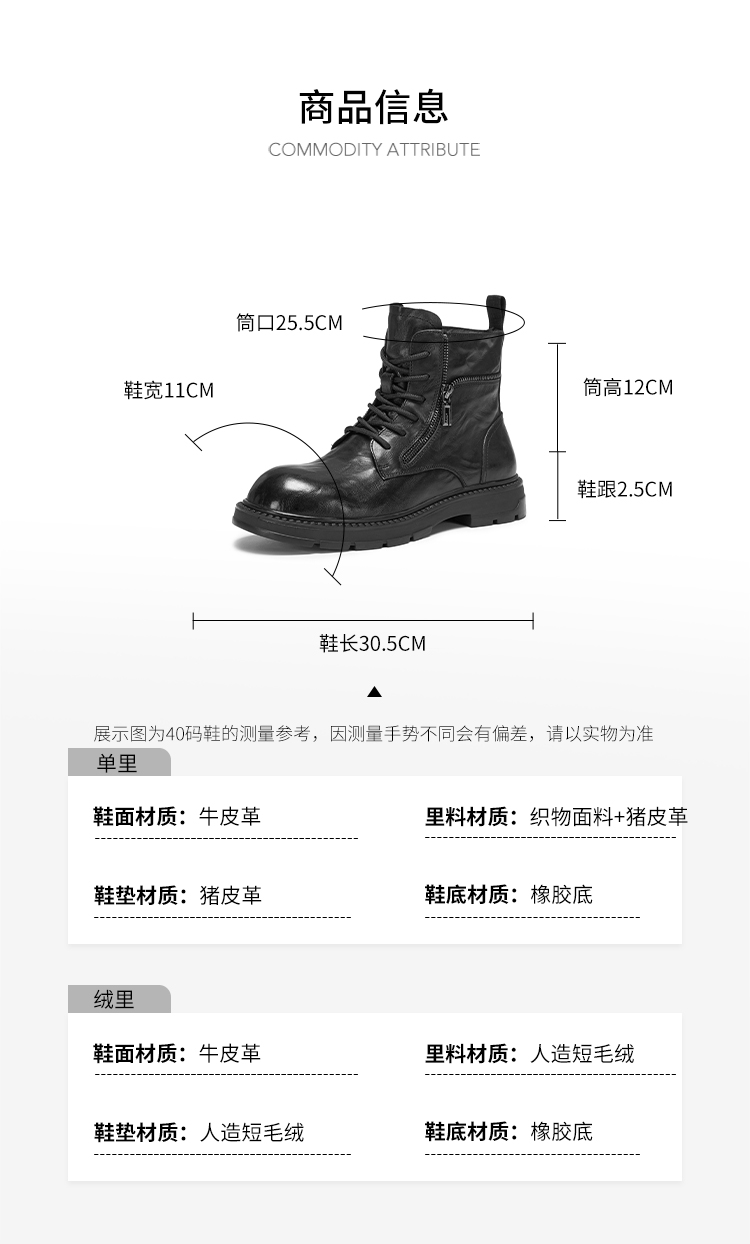 | 40码鞋长参考(男):30.5CM | 鞋底材质:橡胶底 | 靴筒内里材质:人造短毛绒 | 内增高:无 | 鞋面材质:牛皮革 |