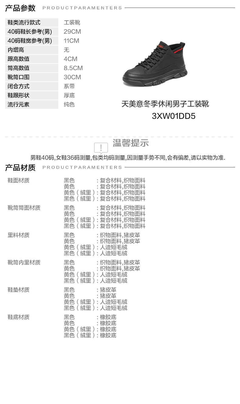 | 闭合方式:系带 | 40码鞋宽参考(男):11CM | 靴筒口围:30CM | 上市时间:2025年冬季 | 鞋类流行款式:工装靴 |