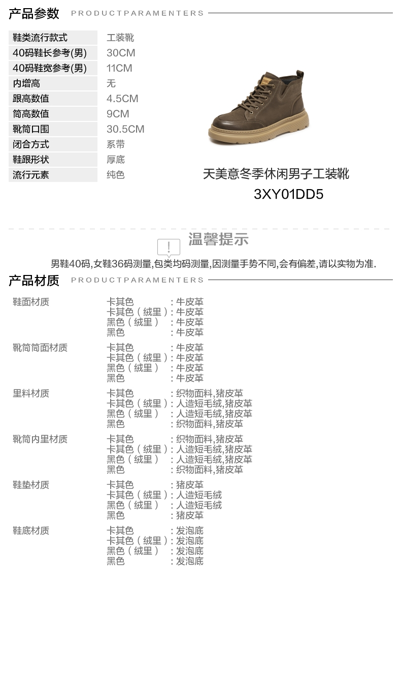 | 闭合方式:系带 | 40码鞋宽参考(男):11CM | 靴筒口围:30.5CM | 上市时间:2025年冬季 | 鞋类流行款式:工装靴 |