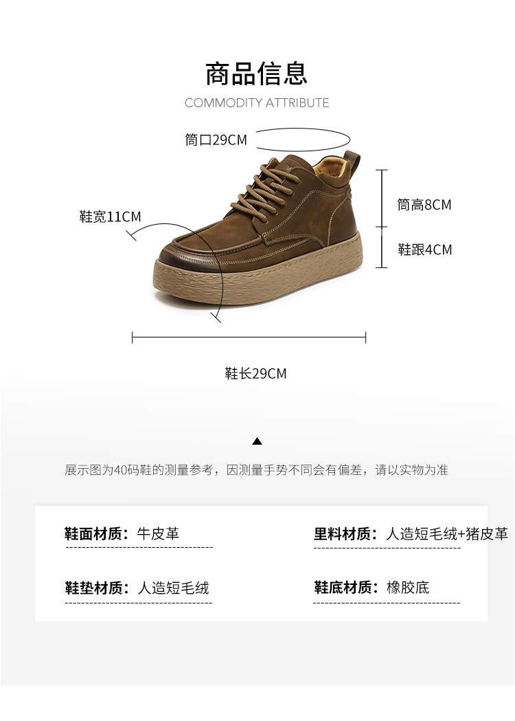 | 40码鞋长参考(男):29CM | 鞋底材质:橡胶底 | 靴筒内里材质:人造短毛绒猪皮革 | 内增高:无 | 鞋面材质:牛皮革 |