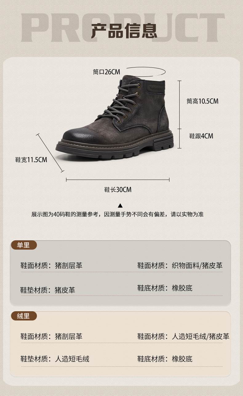 | 40码鞋长参考(男):30CM | 鞋底材质:橡胶底 | 靴筒内里材质:猪皮革人造短毛绒 | 内增高:无 | 鞋面材质:猪剖层革 |