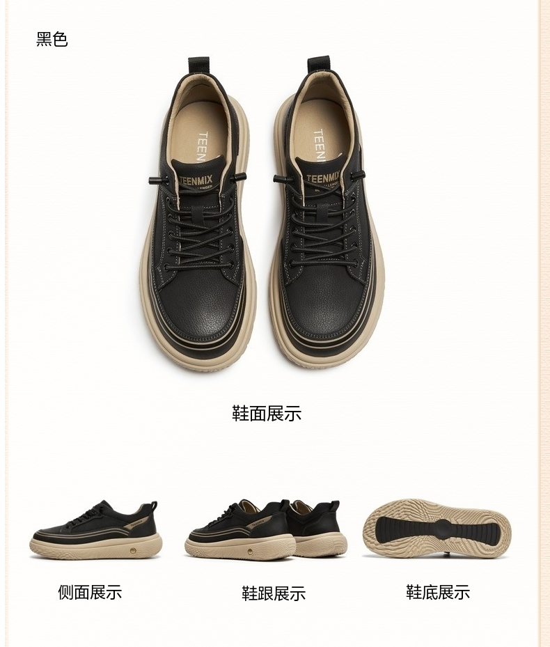 | 内增高:无 | 鞋跟形状:厚底 | 鞋面材质:复合材料牛皮革 | 流行元素:纯色 | 闭合方式:系带 |