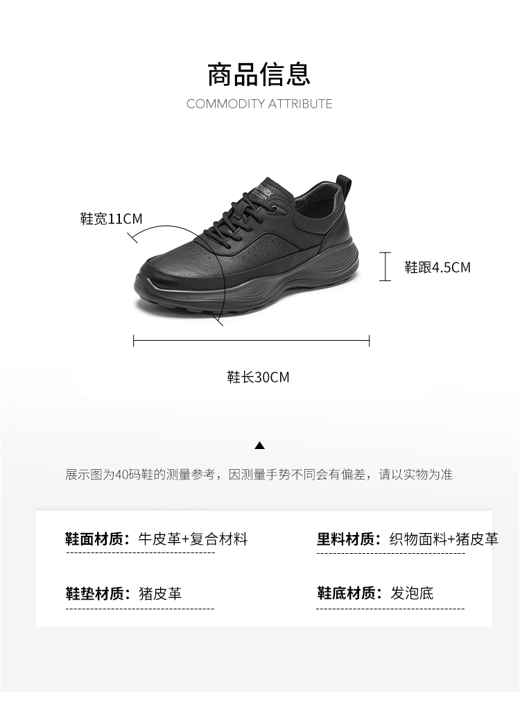 | 风格:休闲 | 色系:灰色 | 跟高数值:4.5CM | 40码鞋宽参考(男):11CM | 性别:男子 |