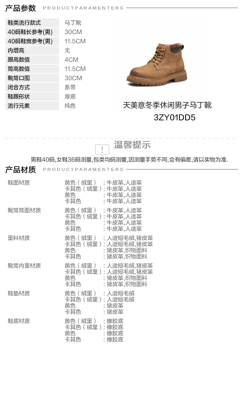 | 闭合方式:系带 | 40码鞋宽参考(男):11.5CM | 靴筒口围:30CM | 上市时间:2025年冬季 | 鞋类流行款式:马丁靴 |