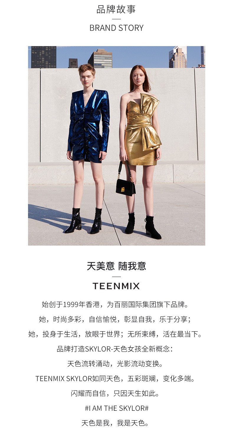 Teenmix(天美意),作为一个都市时尚休闲品牌,倡导“life for fun ,style for teens”即 “人生追求情趣,年轻追求个性”的生活品位,迎合都市年轻人不拘一格,追求mix&match自由组合,创出自我风格的潮流理念。Teenmix向人们展示了流行的转变,强调创意与个性,“teen”代表一群张扬个性、散发活力、追求都市炫彩生活的新新人群;“ mix”即mix&match,代表时尚混搭精神,品牌为年轻人提供恍如贴身订造的时尚潮品,并因应时尚的转变而响应。“随我意,天美意”传达了品牌的主张与个性。