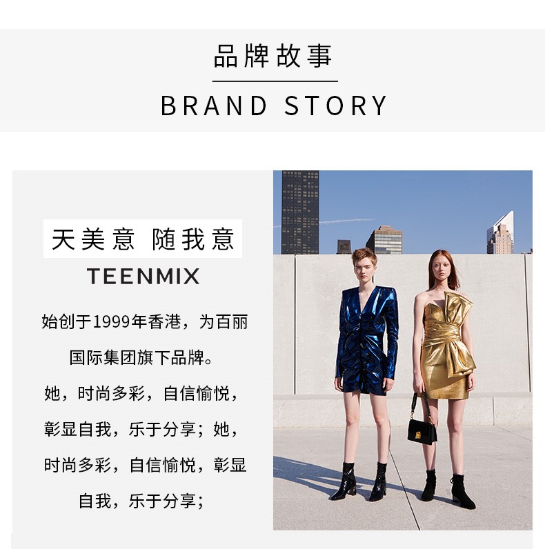 Teenmix(天美意),作为一个都市时尚休闲品牌,倡导“life for fun ,style for teens”即 “人生追求情趣,年轻追求个性”的生活品位,迎合都市年轻人不拘一格,追求mix&match自由组合,创出自我风格的潮流理念。Teenmix向人们展示了流行的转变,强调创意与个性,“teen”代表一群张扬个性、散发活力、追求都市炫彩生活的新新人群;“ mix”即mix&match,代表时尚混搭精神,品牌为年轻人提供恍如贴身订造的时尚潮品,并因应时尚的转变而响应。“随我意,天美意”传达了品牌的主张与个性。