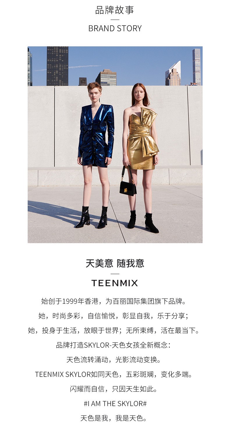 Teenmix(天美意),作为一个都市时尚休闲品牌,倡导“life for fun ,style for teens”即 “人生追求情趣,年轻追求个性”的生活品位,迎合都市年轻人不拘一格,追求mix&match自由组合,创出自我风格的潮流理念。Teenmix向人们展示了流行的转变,强调创意与个性,“teen”代表一群张扬个性、散发活力、追求都市炫彩生活的新新人群;“ mix”即mix&match,代表时尚混搭精神,品牌为年轻人提供恍如贴身订造的时尚潮品,并因应时尚的转变而响应。“随我意,天美意”传达了品牌的主张与个性。