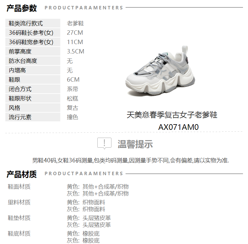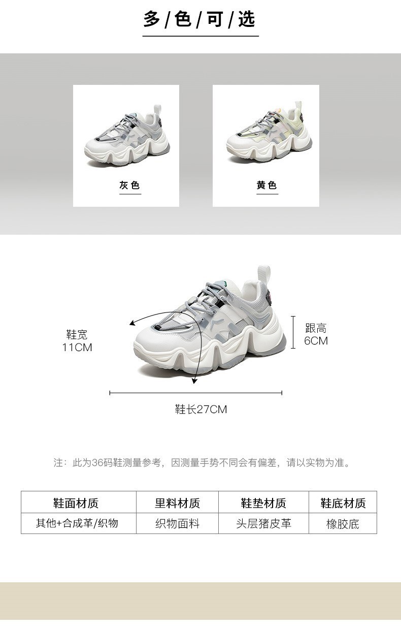 | 皮质特征:织物 | 前掌高度:3.5CM | 防水台高度:无 | 鞋类流行款式:老爹鞋 |