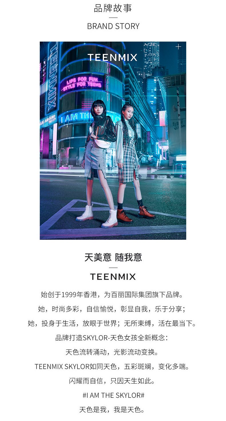 Teenmix(天美意),作为一个都市时尚休闲品牌,倡导“life for fun ,style for teens”即 “人生追求情趣,年轻追求个性”的生活品位,迎合都市年轻人不拘一格,追求mix&match自由组合,创出自我风格的潮流理念。Teenmix向人们展示了流行的转变,强调创意与个性,“teen”代表一群张扬个性、散发活力、追求都市炫彩生活的新新人群;“ mix”即mix&match,代表时尚混搭精神,品牌为年轻人提供恍如贴身订造的时尚潮品,并因应时尚的转变而响应。“随我意,天美意”传达了品牌的主张与个性。