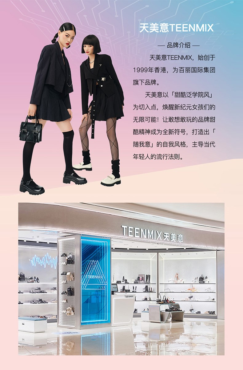 Teenmix(天美意),作为一个都市时尚休闲品牌,倡导“life for fun ,style for teens”即 “人生追求情趣,年轻追求个性”的生活品位,迎合都市年轻人不拘一格,追求mix&match自由组合,创出自我风格的潮流理念。Teenmix向人们展示了流行的转变,强调创意与个性,“teen”代表一群张扬个性、散发活力、追求都市炫彩生活的新新人群;“ mix”即mix&match,代表时尚混搭精神,品牌为年轻人提供恍如贴身订造的时尚潮品,并因应时尚的转变而响应。“随我意,天美意”传达了品牌的主张与个性。