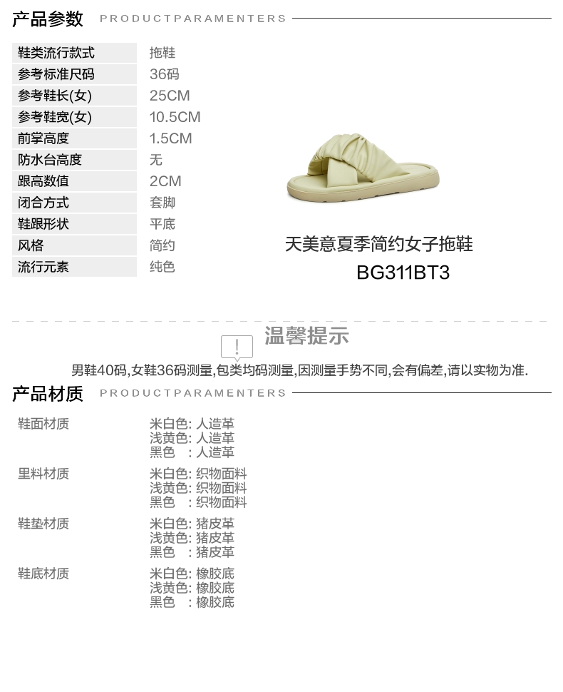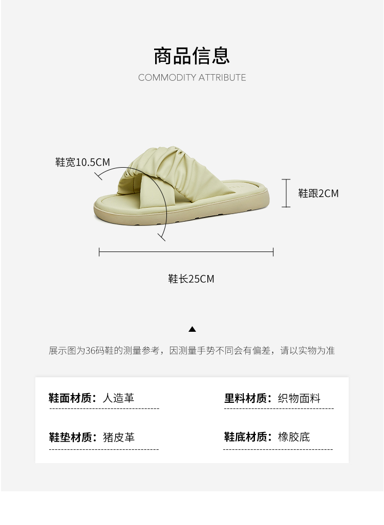| 执行标准:拖鞋 QB/T 4552-2020 | 跟高范围:低跟鞋(小于3CM) | 鞋面图案:纯色 | 鞋跟形状:平底 | 流行元素:纯色 |