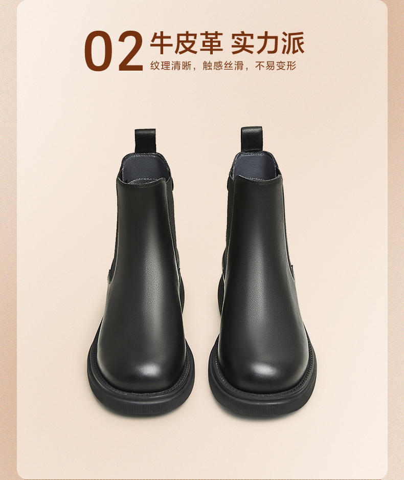 | 帮面材质:织物牛皮革 | 配跟:无 | 靴筒口围:26.5CM | 上市时间:2025年冬季 | 鞋类流行款式:切尔西靴 |