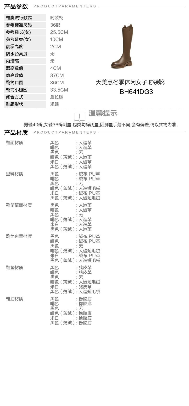 | 风格:休闲 | 色系:咖啡色 | 跟高数值:4CM | 性别:女子 | 筒高数值:37CM |