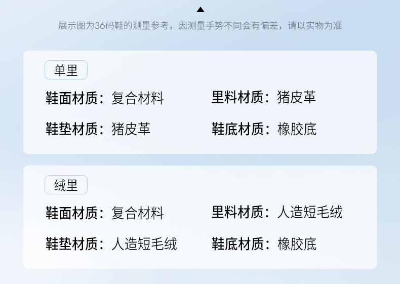 | 鞋垫材质:人造短毛绒 | 前掌高度:1.5CM | 皮质特征:复合材料/织物 | 鞋类流行款式:单鞋 |