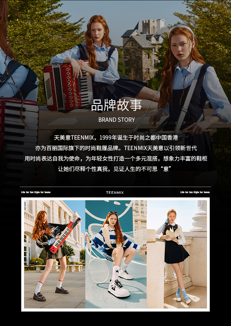 Teenmix(天美意),作为一个都市时尚休闲品牌,倡导“life for fun ,style for teens”即 “人生追求情趣,年轻追求个性”的生活品位,迎合都市年轻人不拘一格,追求mix&match自由组合,创出自我风格的潮流理念。Teenmix向人们展示了流行的转变,强调创意与个性,“teen”代表一群张扬个性、散发活力、追求都市炫彩生活的新新人群;“ mix”即mix&match,代表时尚混搭精神,品牌为年轻人提供恍如贴身订造的时尚潮品,并因应时尚的转变而响应。“随我意,天美意”传达了品牌的主张与个性。