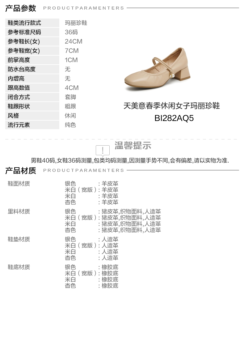 | 年份:2025年 | 色系:杏色 | 参考标准尺码:36码 | 跟高数值:4CM | 性别:女子 |