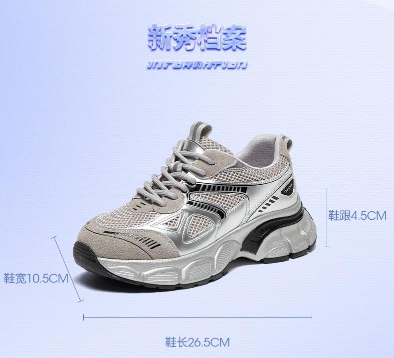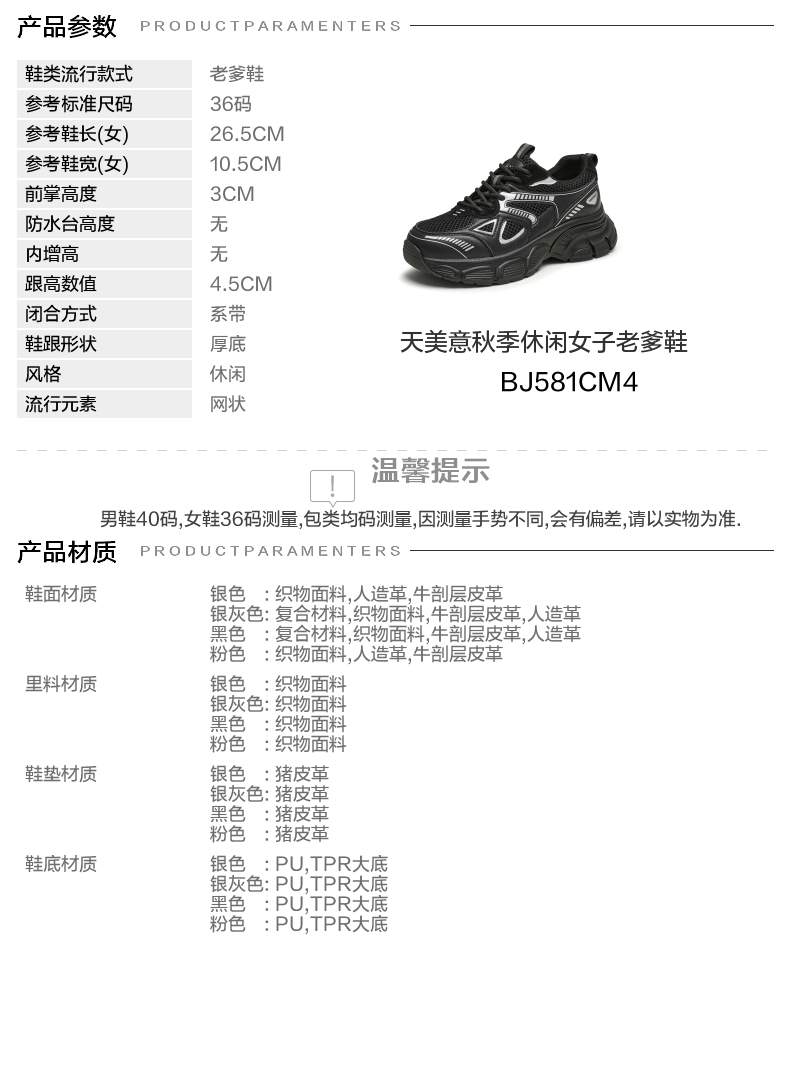 | 风格分类:老爹鞋 | 上市时间:2024年秋季 | 鞋类流行款式:老爹鞋 | 鞋头款式:圆头 | 执行标准:旅游鞋GB/T15107-2013 |