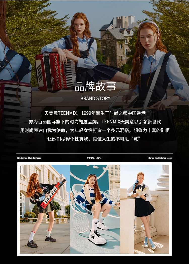 Teenmix(天美意),作为一个都市时尚休闲品牌,倡导“life for fun ,style for teens”即 “人生追求情趣,年轻追求个性”的生活品位,迎合都市年轻人不拘一格,追求mix&match自由组合,创出自我风格的潮流理念。Teenmix向人们展示了流行的转变,强调创意与个性,“teen”代表一群张扬个性、散发活力、追求都市炫彩生活的新新人群;“ mix”即mix&match,代表时尚混搭精神,品牌为年轻人提供恍如贴身订造的时尚潮品,并因应时尚的转变而响应。“随我意,天美意”传达了品牌的主张与个性。