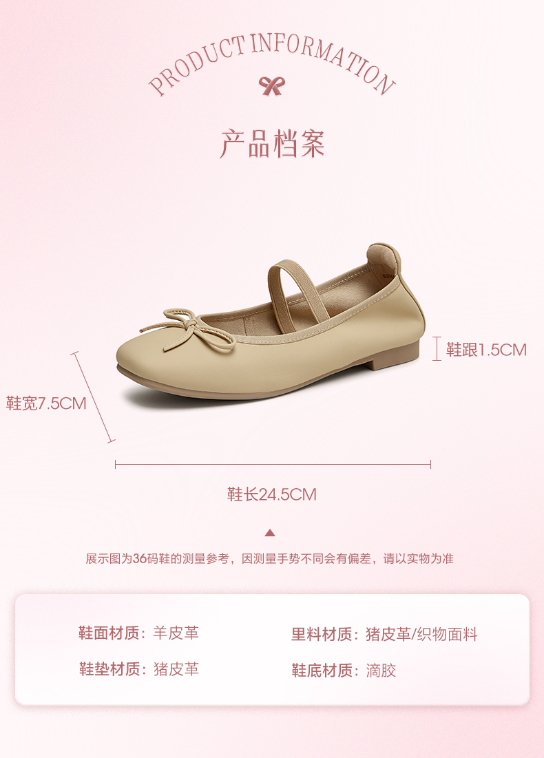 | 鞋面材质:羊皮革 | 流行元素:纯色 | 参考鞋长(女):24.5CM | 参考鞋宽(女):7.5CM | 闭合方式:松紧带 |