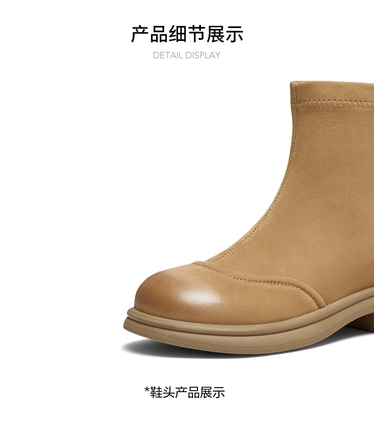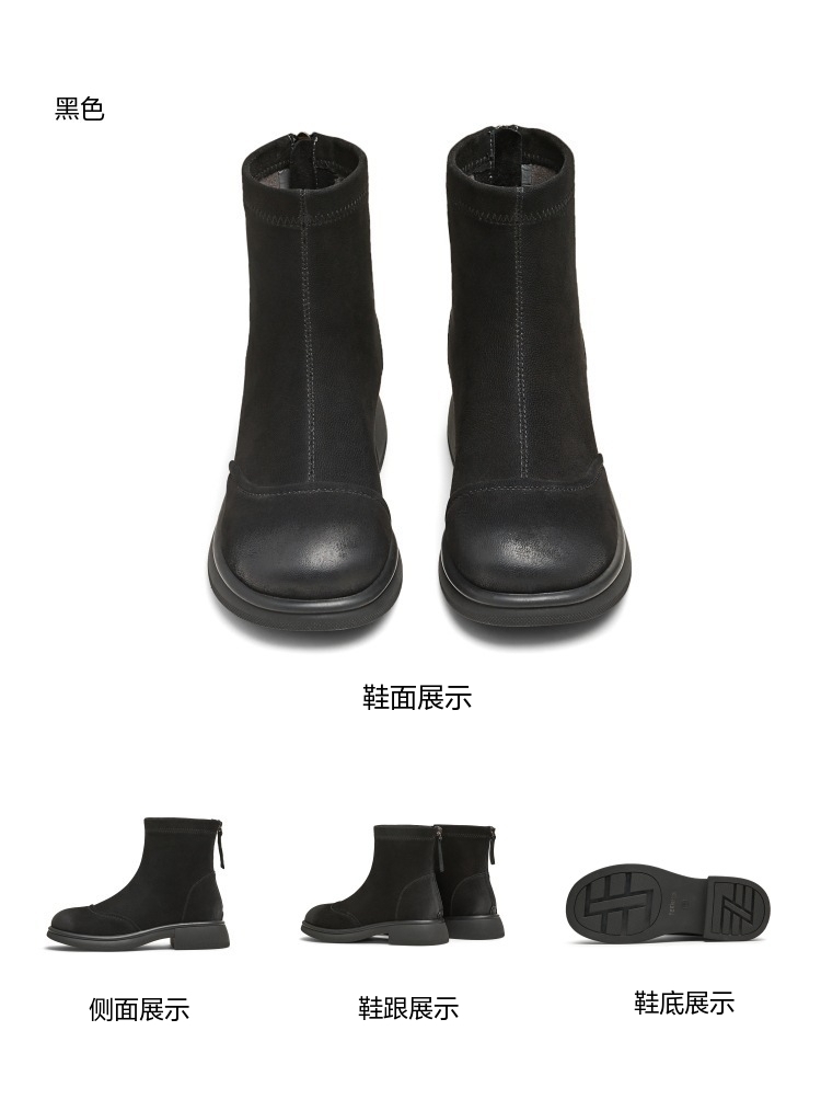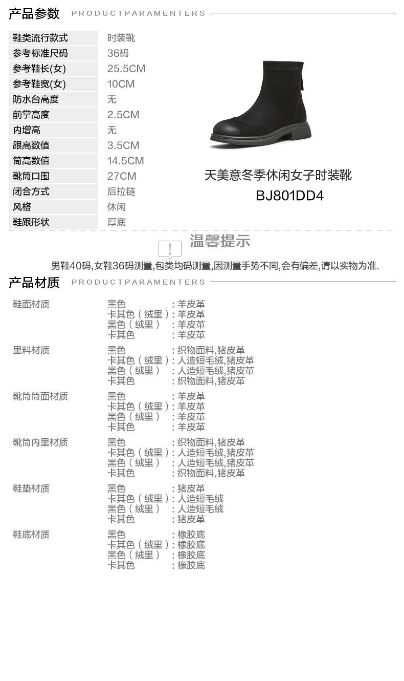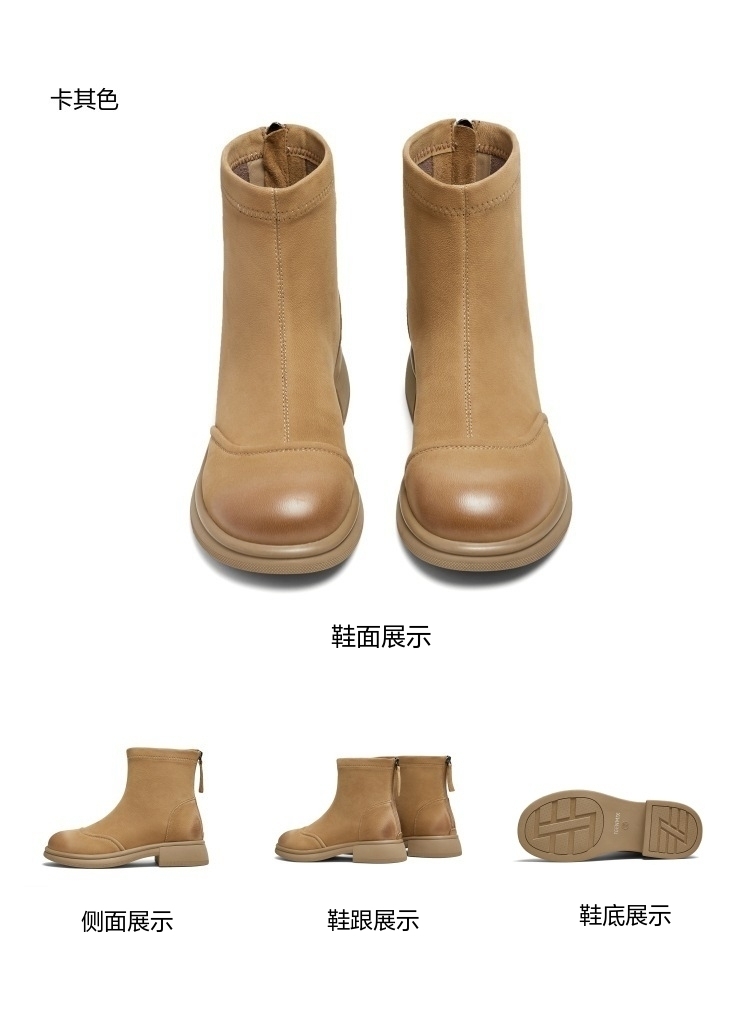 | 鞋底材质:橡胶底 | 靴筒内里材质:猪皮革织物面料 | 内增高:无 | 鞋面材质:羊皮革 | 闭合方式:后拉链 |