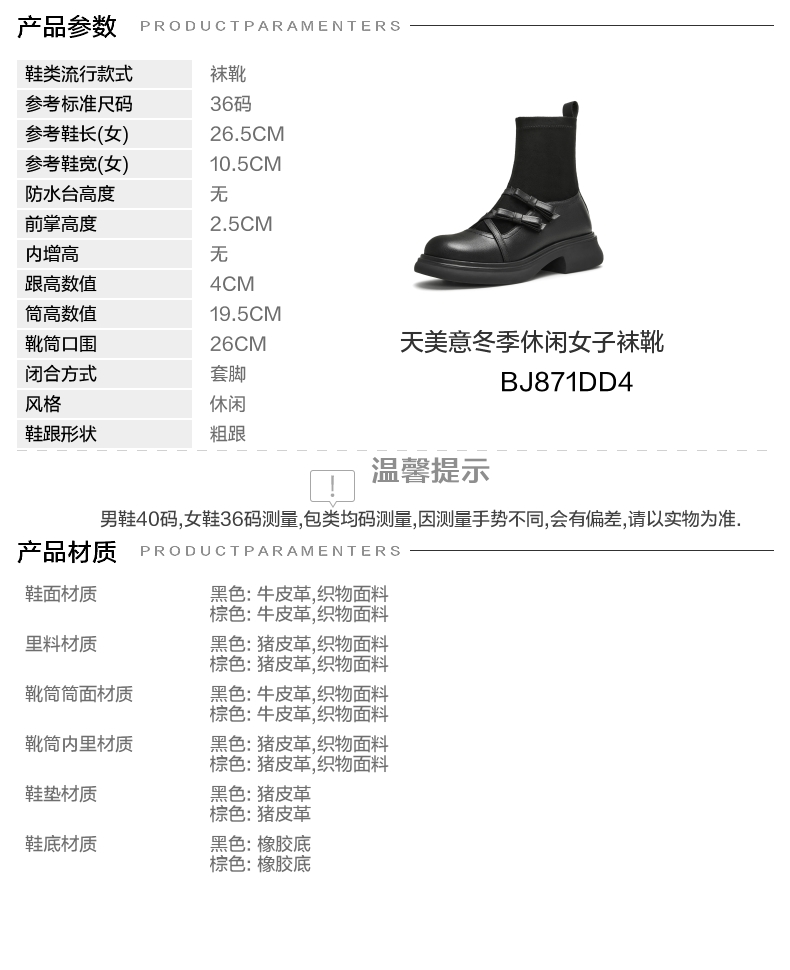 | 参考鞋宽(女):10.5CM | 风格:休闲 | 色系:黑色 | 跟高数值:4CM | 筒高数值:19.5CM |